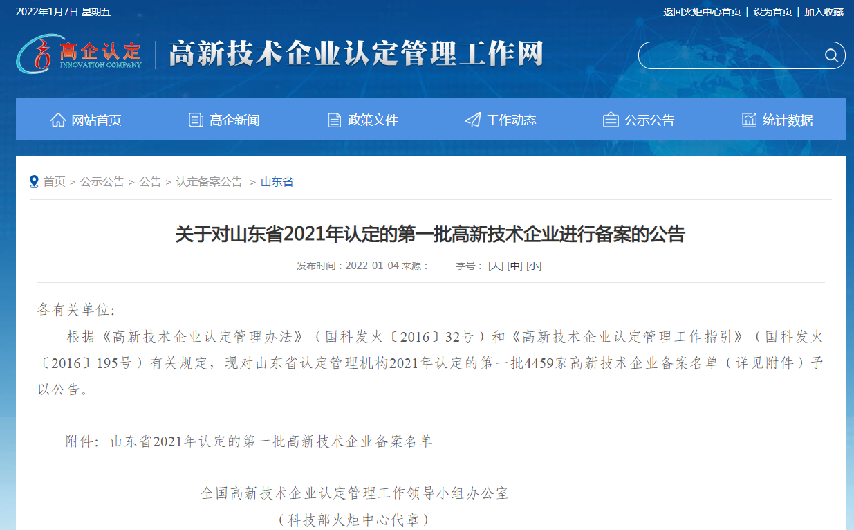 2022年1月4日,全國高新技術企業認定管理工作領導小組辦公室發布《關于對山東省2021年認定的第一批高新技術企業進行備案的公告》。據公告顯示,山東奧翔電力工程設計咨詢有限公司被列入《山東省2021年認定的第一批高新技術企業備案名單》。